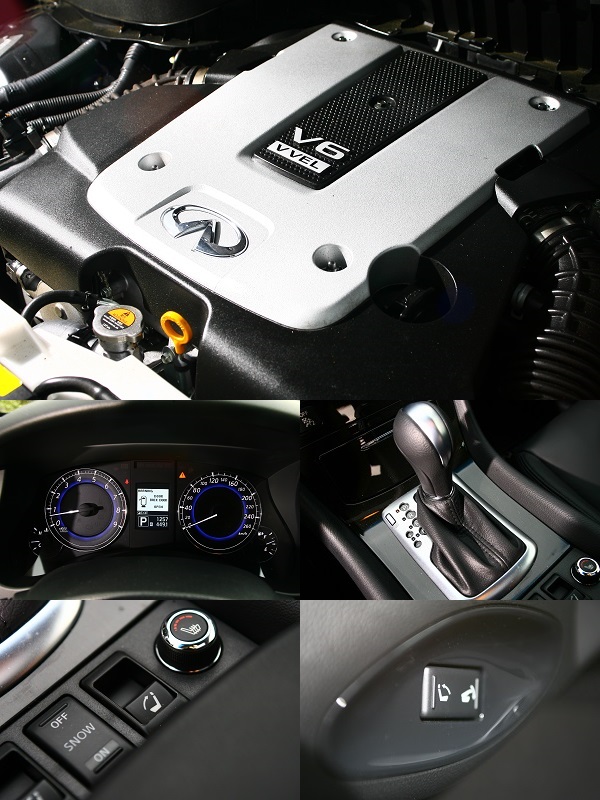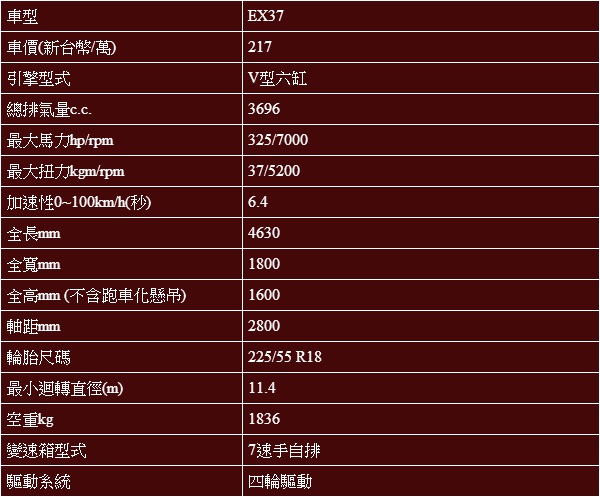 我想,這次的試駕應該可以把焦點完全放在動態表現即可,因為換心後的EX37,與過往除了動力輸出以外,其他全然相同。看外觀,圓潤流暢的線條依舊;由車艙,質感不俗但空間有限的特色也仍在;配備上,包括六氣囊、VDC、TCS、EBD、BAS乃至環景顯影系統與胎壓偵測系統俱全,甚至雙前座電動椅、電動方向盤調整、I-Key智慧型鑰匙、後座椅背一指傾倒電動回復、附衛星導航多媒體影音裝置與Bose音響也應有盡有。可以說,扣除主觀認定的造型設計以及空間需求外,EX37在硬體上實在沒有什麼可供挑剔之處。