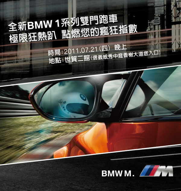 即將於2011年7月21日上市的BMW全新1系列雙門跑車與全新1系列M款純種雙門跑車,為了直接傳遞其爆發動力,BMW總代理汎德公司即將於2011年7月21日,假台北市信義區世貿二館,舉辦台灣車壇首見的「BMW極限狂熱趴」,邀請2011年金曲獎最佳團體MATZKA、夢幻女神組合Dream Girls、與熱力唱將彭佳慧、康晉榮,加上DJ的奔放節奏,讓你和BMW 1系列雙門跑車熱力1整晚、狂歡不停歇!