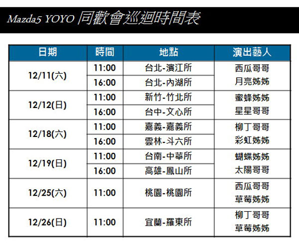 除此之外,小朋友們最喜愛的YoYo台的大哥哥大姊姊,將從本週起於全省MAZDA展間進行「Mazda5 YoYo同歡會」全省巡迴演出,帶領小朋友開心唱歌玩遊戲。本週六日(12/11、12/12),活動將從台北、新竹、台中等四個展間揭開序幕,在接下來的週末裡會進行全省巡迴表演,歡迎爸媽帶著小朋友一起前來同樂!活動時間地點等詳情可至MAZDA Taiwan官方網站http://www.mazda.com.tw查詢。