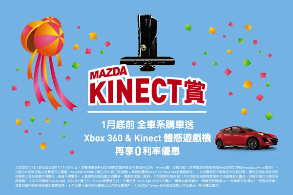 甫落幕的2011年台北國際新車大展中,Mazda攤位看車人潮不斷,短短4天展期即接下超過120輛訂單,銷售成績耀眼!為回饋消費者,並為農曆年前購車增添人氣,Mazda特別推出「Mazda Kinect賞」購車優惠活動,即日起至2011年1月31日期間,購買Mazda全車系新車並於1月完成領牌手續,即可獲贈目前市面上最火紅的XBOX360 250G遊戲主機,與Kinect動態感應器,內附兩款遊戲與相關配件(以實物為準,視套裝內容市價約15500~16500元),與Mazda「Zoom-Zoom」品牌精神完美匹配,成為本屆車展最動感的購車好禮!消費者不僅能在農曆年前開心入主Mazda新車,還能將XBOX360 250G主機+ Kinect組合帶回與家人同樂,新年假期時還可邀請親朋好友來家中賞Mazda新車,熱鬧體驗XBOX360 + Kinect的動感樂趣!歡迎消費者參觀2011年台中國際新車大展,親身體驗Mazda全車系優質車款,並把握農曆年前入主Mazda新車的最佳良機!