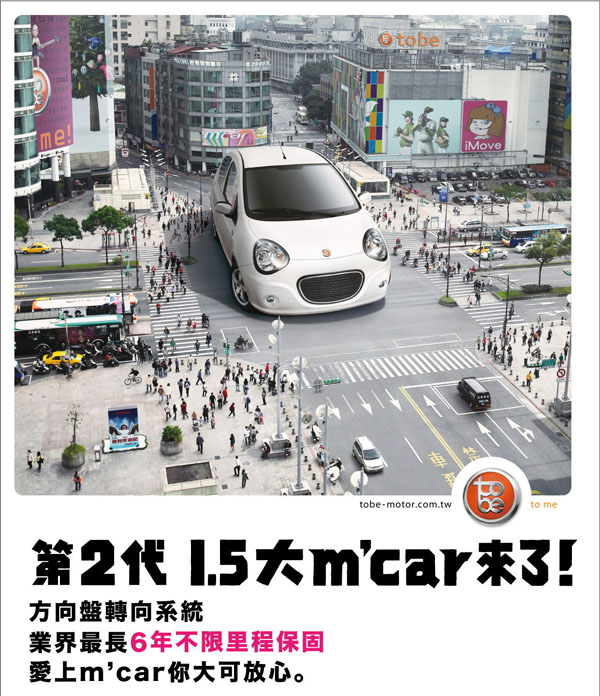 Tobe 裕隆酷比汽車甫於元月8號推出的2011年式 M’Car 1.5L 第二代全新車款,以更充沛的動力輸出,提供消費者不同選擇。此外,Tobe以雲端概念提供車主安心用車的貼心體驗,在新車 3 年不限里程保固,再追加汽車業界首創、針對 M’Car 轉向系統全面6年不限里程延長保固,進一步落實對車輛安全的品牌承諾,在Tobe M’Car車主擁有最頂級的汽車安全防衛外,更可安心駕駛著Tobe M’Car,實現生命中充滿樂趣的每一段旅程。