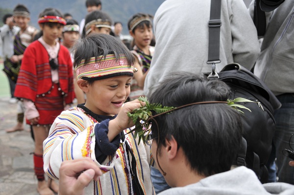到達目的地梅園國小,小朋友們為車友們戴上親手編織的花圈頭飾與迎賓歌舞,表達歡迎之意。