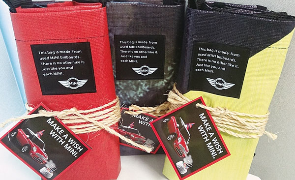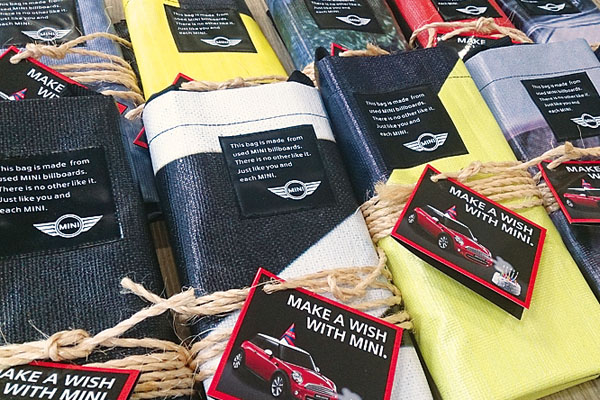 Mini回收活動中所使用的帆布,由師傅們親自清洗、丈量裁剪、細心縫製,用心製作出一個個獨一無二的Mini環保購物袋*。8月1日起,Mini於全台展示中心限量義賣Mini環保購物袋,每只義賣價390元,Mini也歡迎您自由樂捐,而義賣與樂捐所得將全數捐贈予志在為重症病童實現願望的「中華民國喜願協會」,Mini和每一位因您而實現夢想的孩子,誠摯地感謝您的支持響應。