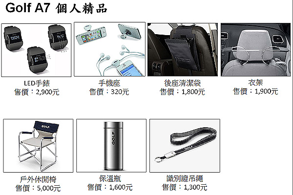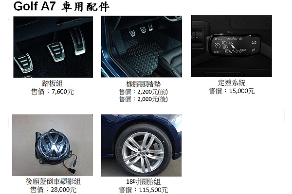 Volkswagen總代理太古標達汽車為即將入主7代Golf的車主們準備了包括外觀空力套件、18吋圈胎組、車內精品與定速系統以及倒車顯影等售後服務配件,讓7代Golf的車主們能夠依自己的喜好,升級自身的愛車。並且提供多款個人精品供消費者選購,讓愛車、個人擁有相同的風格。