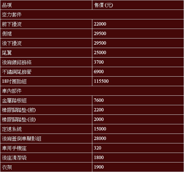 外觀空力套件包括前下導流、側裙、後下導流、尾翼與不鏽鋼尾飾管等套件。