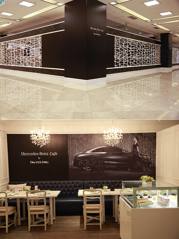 設計靈感來自於英國知名女建築師札哈哈蒂(Dame Zaha Hadid) 為 Mercedes-Benz 125 周年所設計的概念車,模仿車輛於高速行駛中,飛快流動的線條,交織成令人目眩神迷的空間,打造流線簡潔的Mercedes-Benz Café by Dazzling。