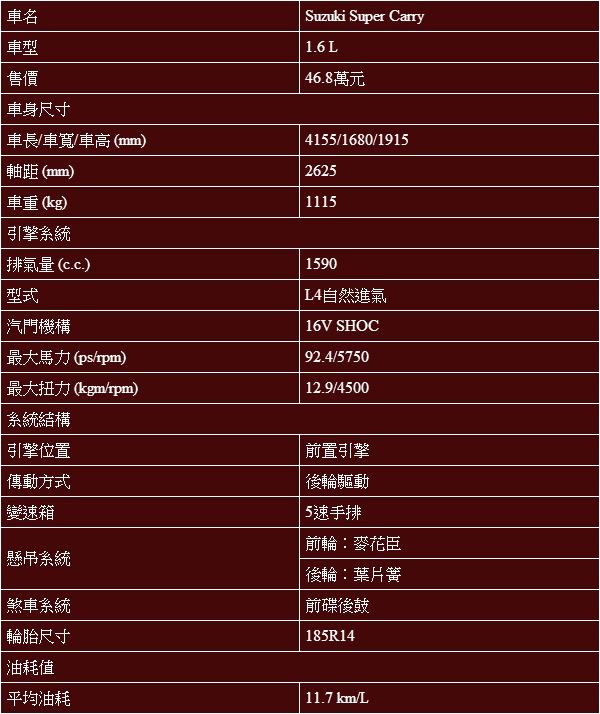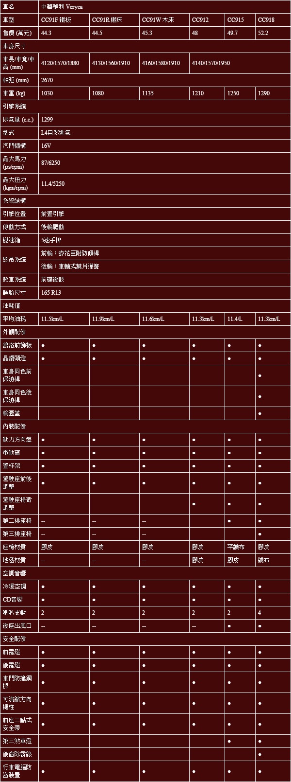 Super中華菱利Veryca規配表: