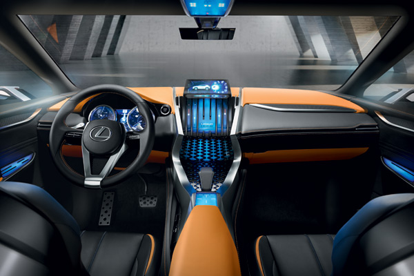 LF-NX的內裝同樣與外觀設計相呼應,而以駕駛人為導向的座艙設計,更提供符合人體工學的駕乘環境。在Lexus L-finesse「以人為本」的設計理念下,中控台上層顯示、下層操作的區隔設計,也與歷代Lexus車款相同。LF-NX所搭載的次世代人車互動科技,包括有觸控感應式的靜電開關、以及全新觸控面板形式的RTI(Remote Touch Interface)介面,這些科技都提供更為直覺化的操作。
