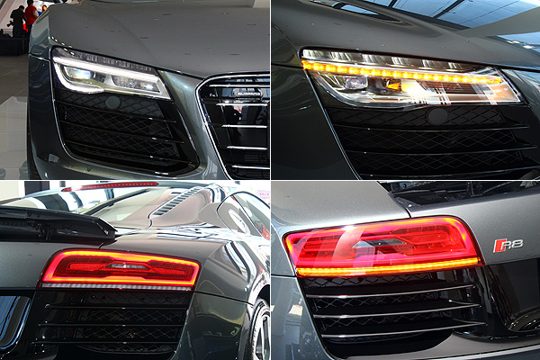 小改款R8最明顯的更新,在於外觀上的小幅修飾。雖然同樣採用全LED頭燈,但新款的頭燈造型與LED晝行燈組,搭配中央的單體式六角盾形水箱護罩,讓R8擁有更為精悍的面容。雖然尾燈輪廓並未進行大幅更改,但重新設計的燈組,顯示出更具科技感的燈形,搭配動態顯示的後方向燈,擅長使用LED照明技術的Audi在R8身上發揮的淋漓盡致。