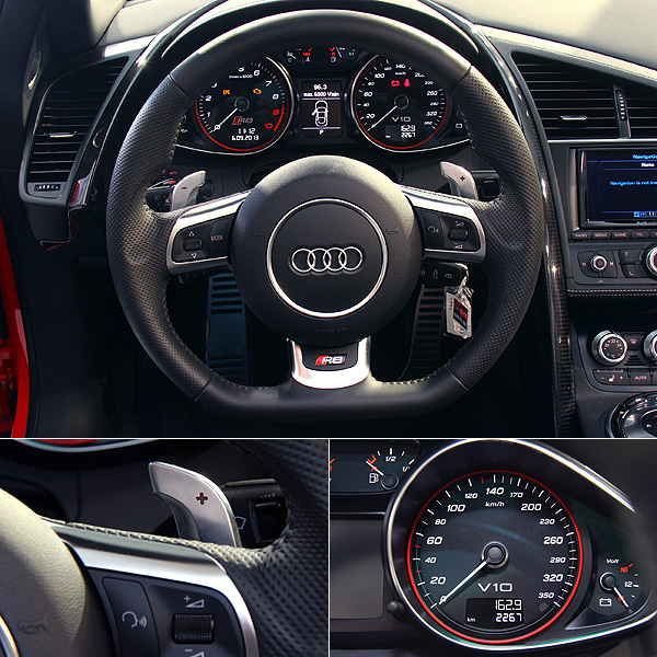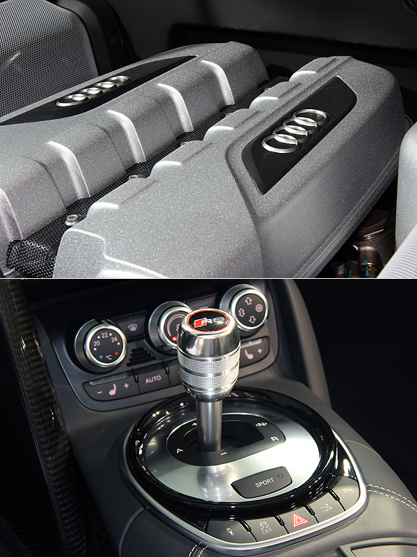 最主要的變動,還是在於變速箱的更改,原先搭配的6速R tronic單離器自手排變速箱不再使用,所有V10動力車型改搭7速S tronic雙離合器變速箱,兼顧動力傳輸效率與節能表現。同時,在R8所搭配的S tronic變速箱中,進入Sport模式後,不僅能夠提供更為高亢的聲浪,並且附有Launch Control彈射起步裝置,能夠以更迅捷的方式起步。改搭7速S tronic雙離合器變速箱後,R8 Coupe只需3.6秒便能完成0-100km/h加速,R8 Spyder雖然受敞篷機構重量影響,也僅需3.8秒便能由靜止加速至100km/h,兩者的極速則分別為314km/h與311km/h。