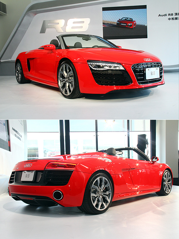 雖然2009年9月Audi Taiwan便為臺灣市場引進R8車系,但採用5.2 V10單一車型的設定,敞篷版本的R8 Spyder並無緣透過Audi Taiwan之手進入臺灣。隨著Audi在2012年下半年為R8進行小改款更新,導入新款頭尾燈,並改搭S tronic雙離合器變速箱之後,Audi Taiwan便趁著中和展示中心揭幕的機會,一同引進小改款後的R8與R8 Spyder,同樣採用單一的5.2 V10 FSI動力設定,並開出1083萬與1152萬元的建議售價。