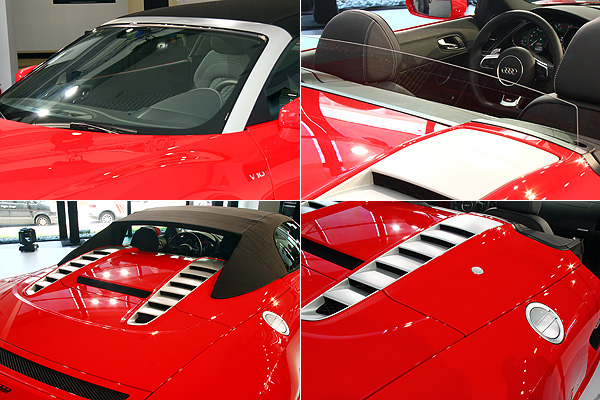 金屬色的A柱窗框、引擎蓋鰓狀散熱孔,還有後座後方兼作回風網功能的升降式檔風玻璃,是R8 Spyder的特色。