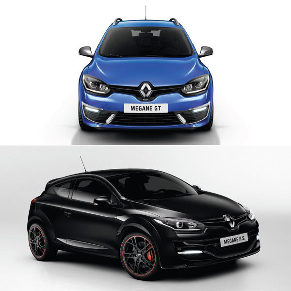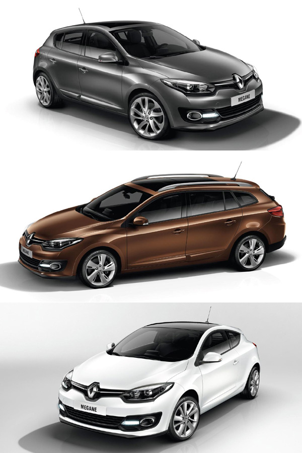Megane車系的改變,包括Megane Hatchback五門掀背、Megane Estate五門旅行車、與Megane Coupe三門掀背現在擁有了統一的車頭視覺,包含前保桿、引擎蓋等部件皆完全相同,而按照車型配備等級不同,也將有各自專屬的識別配件;此外,上述三款Megane車型也新增了橢圓形前霧燈的配置。