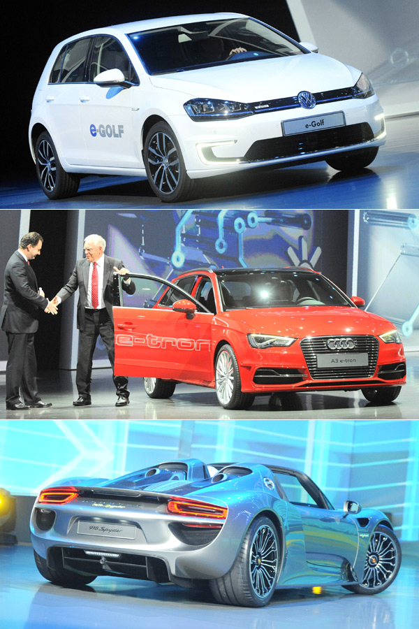 VW集團之夜裡現身的綠能移動科技先驅,包括有純電動的VW e-up!與e-Golf,而Plug-in hybrid插電充電式油電複合動力車款,則包括有Audi A3 e-tron、Porsche Panamera S E-Hybrid、與正式以量產車身份現身的油電超跑Porsche 918 Spyder。包含純電動車、油電複合動力、與替代能源車款在內,VW集團預計2014年在市面上將提供多達14款的市售綠能車款,而在原訂2018年計劃達成前的中期、也就是莫約2016年時,集團旗下的市售綠能車陣容更將拓展至40款。