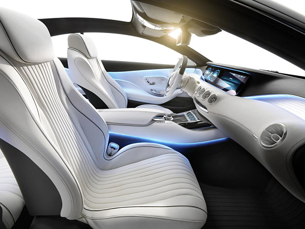 車室內以白色作為營造典雅的關鍵,並於其中巧妙安排了科技味,儀表板與中控台上兩只12.3吋的8:3比例螢幕,提供儀表資訊與車載資訊平台畫面。有著5050×1985×1409mm車身尺碼的S-Class Coupe概念車,軸距為2945mm,搭配21吋的大尺碼輪圈,不過未來於量產車型會如何搭配,仍尚待時間解答。