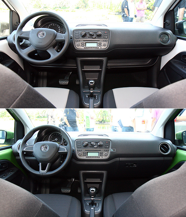 車室內部Citigo雖然維持Škoda一貫的簡約設計,創造以實用為導向的設計,沒有過多花俏的線條與設計,以就手、便利為主要的設計目標。依照車型的不同,車室有鋪陳也略有不同,入門的Active車型選擇以4輻式方向盤作為搭配,而Elegance車型則配備較具運動風格的3輻式方向盤,以創造較為活潑的動感氛圍。