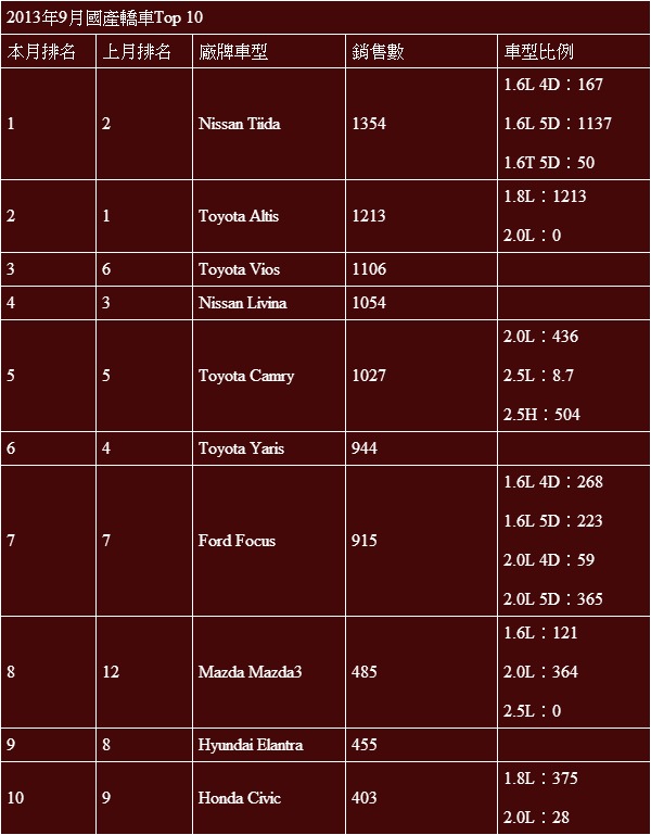 本月躍居龍頭的Nissan Tiida,有著1354輛的銷售成績,但更值得期待的,由於10月份同時推出全新世代Sentra與Altis,兩者交鋒,勢必會對未來的銷售排行榜作出影響,Tiida能否持續佔有優勢,值得觀察。至於另一當紅炸子雞Livina則表現同樣搶眼,以1054輛的成績穩坐第4名。