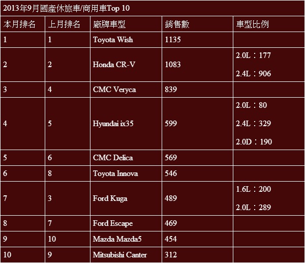 除此之外,Wish、CR-V、Escape等國產休旅車型的變動不大,銷量呈現十分穩定的狀態;商用車市場也相同,Veryca、Innova與Canter維持平盤。