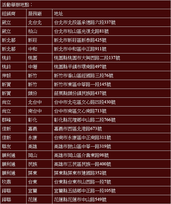 除此之外,為回饋答謝Suzuki車主長期的支持與愛護,凡於活動時間於指定地點實施免費檢查的車主朋友,即可獲得精美禮品(數量有限,送完為止!),並於活動當日現場備有精緻小點心,歡迎闔家光臨。