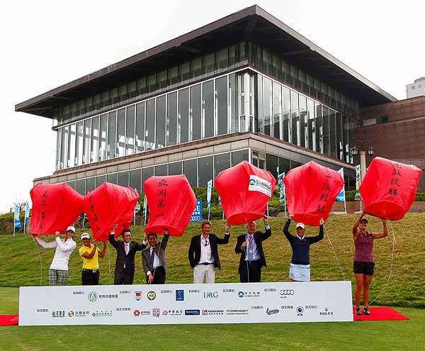LPGA台灣錦標賽熱力開打!比賽唯一指定用車贊助商-台灣奧迪汽車總裁邱山祥(左三)偕同品牌大使台灣之光曾雅妮(左二)以及來自世界各國的明星選手一同施放祈福天燈,預祝比賽旗開得勝。