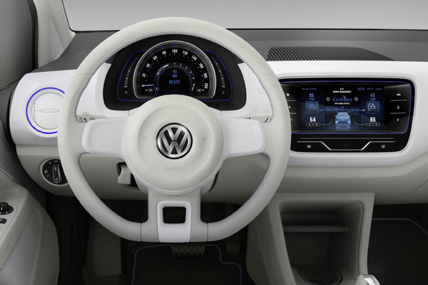 陶瓷灰白色為twin up!概念車內裝的色彩基調,而全數位化的儀表、空調操作顯示,則是VW車款的首創。