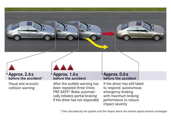 Mercedes-Benz自投入車輛安全研究後,一向都是研發的龍頭,至今多項大家所熟知的車輛安全防護系統,都是由Mercedes-Benz而來,然而Mercedes-Benz認為讓各項系統單打獨鬥、各自做動,無法發揮最佳的效用,因此將各主、被動安全系統以全新的概念加以整合,並且將汽車安全規劃為四階段,最終研發出PRE-SAFE主動式安全防護系統,而且該系統也隨著不同地安全系統誕生而跟著進化,以求最完善的安全防護。