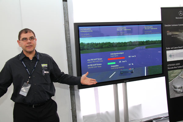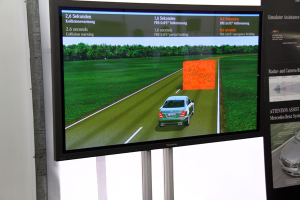 其中還有PRE-SAFE Brake系統體驗,駕駛者模擬以60km/h左右的車速接近障礙物,當雷達偵測車輛至撞及障礙物間的時間僅剩2.6秒時,便會發出警告,並且介入輔助減速,剩1.6秒時主動束緊安全帶,這期間駕駛者都未有任何反應與減速動作時,最後的0.6秒該系統便會全力煞車,減緩撞擊力量,但該系統並不會完全將車煞停,而是利用整體防護降低撞擊後的傷害,最後系統還會計算出自系統啟動時的速度至撞擊時的速度間,降低了多少撞擊力道,以證明該系統效果。在過程中,原廠講師也提到當系統介入初期並未全力煞車的原因,是為了讓駕駛者保有迴避危險的空間與時間,至於該判斷何時是最後的迴避機會,大致上就是當PRE-SAFE系統開始介入束緊安全帶時,便可在安全許可下進行迴避,在整個體驗的過程中,Mercedes-Benz鮮少以速度做為系統或駕駛者判斷的依據,大多是以時間為依據,以往我們會單純的認定在什麼速度下會有什麼結果,總是有些模糊,然而Mercedes-Benz改以時間為依據,例如:車輛在幾秒後可能與前方追撞,可以更直接地反應出危急即將發生的急迫性,提醒駕駛者必須時時刻刻地注意行車安全。