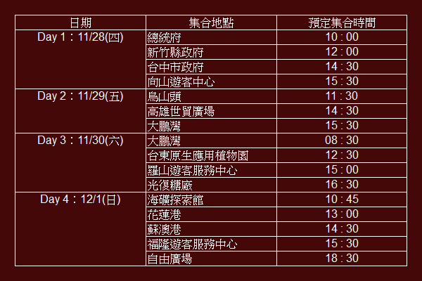 每日行程與預定時間表詳細如下表: