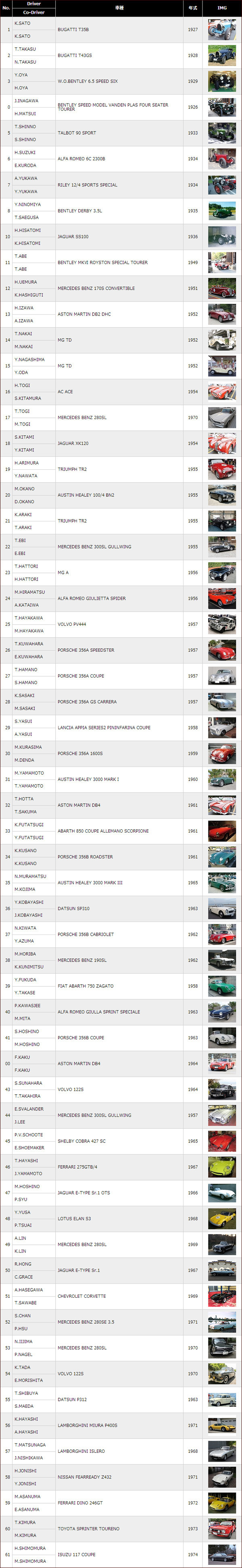 本次活動來台車輛總值約日幣10億(約台幣3.1億),共60輛的古董車,皆為在日本領有合法牌照、可正式上路之車款,車款詳細如下: