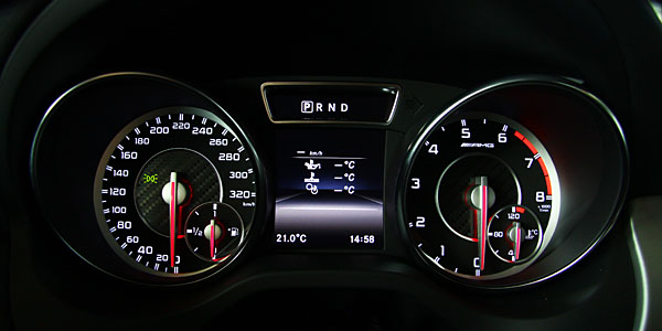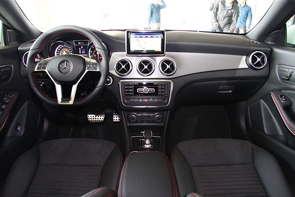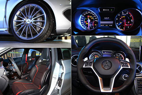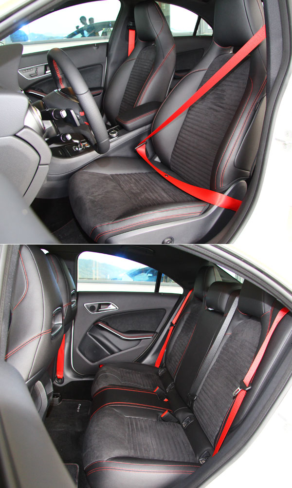 座艙內的戰鬥氣息也與所有 AMG 車款相同。一進入車室,首先會被那由ARTICO 皮革與 DINAMICA 織布混搭的跑車化座椅所吸引,搭配上座椅的紅色車縫線與呼應的紅色安全帶、帶有換檔撥片的多功能方向盤,一一帶領駕駛者進入最具 AMG 風格的戰鬥座艙。細節處更是精彩,絲紋鋁質的飾板、AMG 專屬儀表板、鍍鋅空調出風口與計時儀器,更為 CLA 45 AMG 4MATIC的性能血統作了畫龍點睛的結尾。