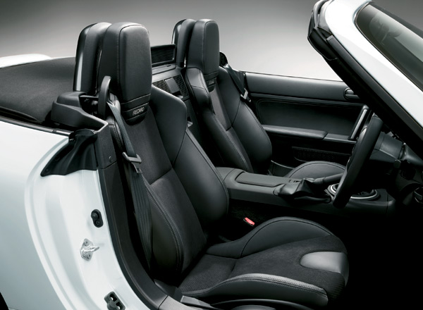 採Alcantara麂皮與真皮材質混搭的Recaro桶型座椅,在新年式列為軟篷Roadster RS、電動摺疊硬頂RS RHT等兩款頂級車型的獨立選配項目。