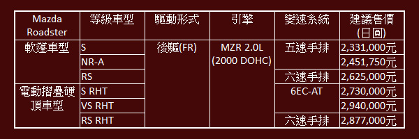 新年式Mazda Roadster全車系車型、建議售價如下: