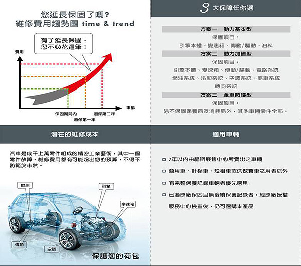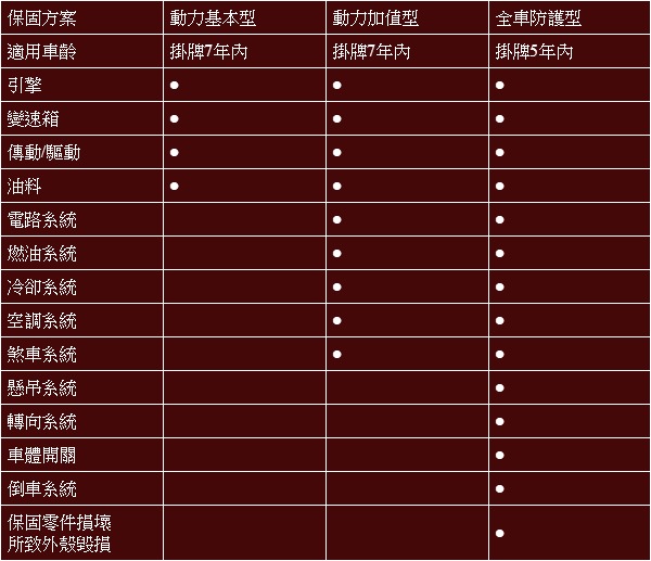 此7年延長保固方案提供了3種不同的延長保固方案,包括基本的動力基本型、動力加值型與全車防護型,詳細內容與價錢請洽保養廠與展售中心。