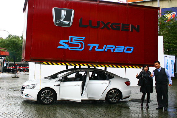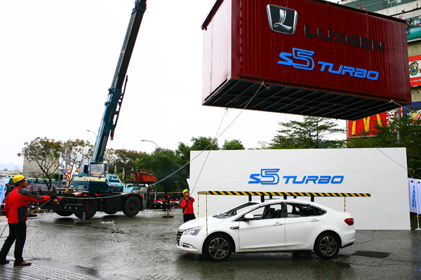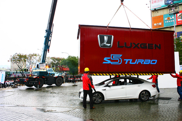 而整個發表會活動的最高潮,則是一場別開生面的〝泰山壓頂〞測試,當工作人員引領所有與會來賓至外頭廣場後,由一輛大型吊車將一只20呎、重量2.4噸的貨櫃〝放上〞Luxgen S5 Turbo的車頂,如此一來不僅肉眼看車體全無變形,即便將四扇車門開啟關閉也全無窒礙,由此應證Luxgen所強調的高剛性車體確實能夠有效抵抗事故發生時強烈力道的衝擊,確保車內所有人的安全。