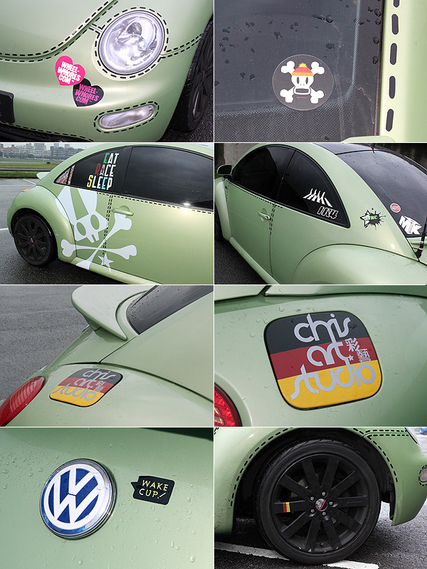 順著鈑件邊緣,猶如牛仔褲縫線般的車貼遠遠的就吸引人們目光,雖然可惜這輛被命名為「跑得快」的Beetle並非如同The Beetle 1.4 Sport的丹寧藍車色,卻也散發十足的設計感。雖然除了腳下的圈胎組合外,這輛車並沒有進行太多的改裝。只透過自行設計的縫線車貼、與設計師合作的骷顱頭圖樣以及各色小貼紙,再加上車內的可愛飾品,創造出十足少女的風情。