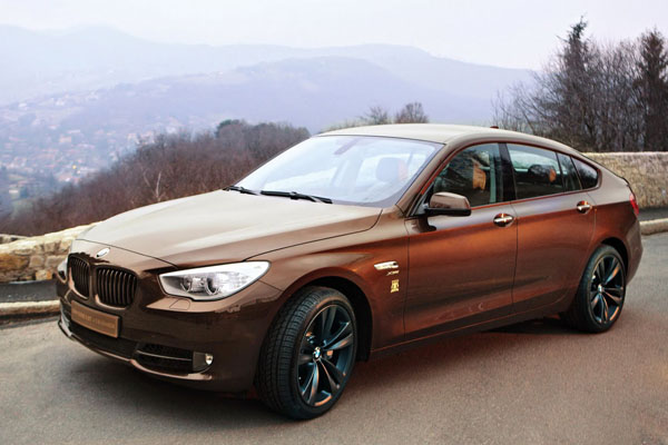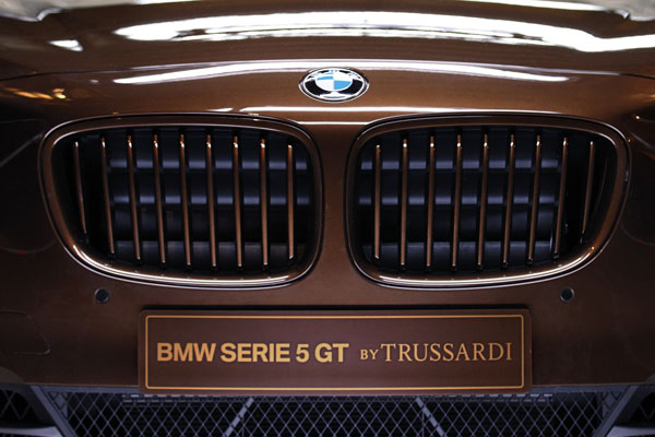 此輛5-Series GT特仕車型,外觀上運用了名為Heraldic Brown的咖啡色車漆,包含著稱的雙腎形水箱罩飾框與車窗飾條等,也採取車身同色處理;20吋的輪圈採用消光深灰色澤搭配,展現出專屬於Trussardi的低調奢華。