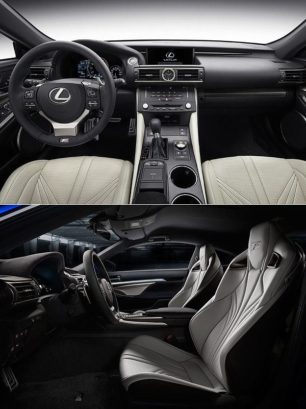 在現有釋出的廠圖中,Lexus也一併揭露RC F的內裝鋪陳,中控台與儀表板的設計,皆延續了現有IS車系的手法,不過動態駕駛模式旋鈕與Remote Touch操控界面的位置與臺灣現有的IS車系相反,同時也導入了觸控手寫板的功能,是與現行IS車系最明顯的不同。除此之外,由於身為性能產品的緣故,RC F選用造型獨特的跑車化座椅,讓車室內部能夠散發與外型相同的誇張氣息。