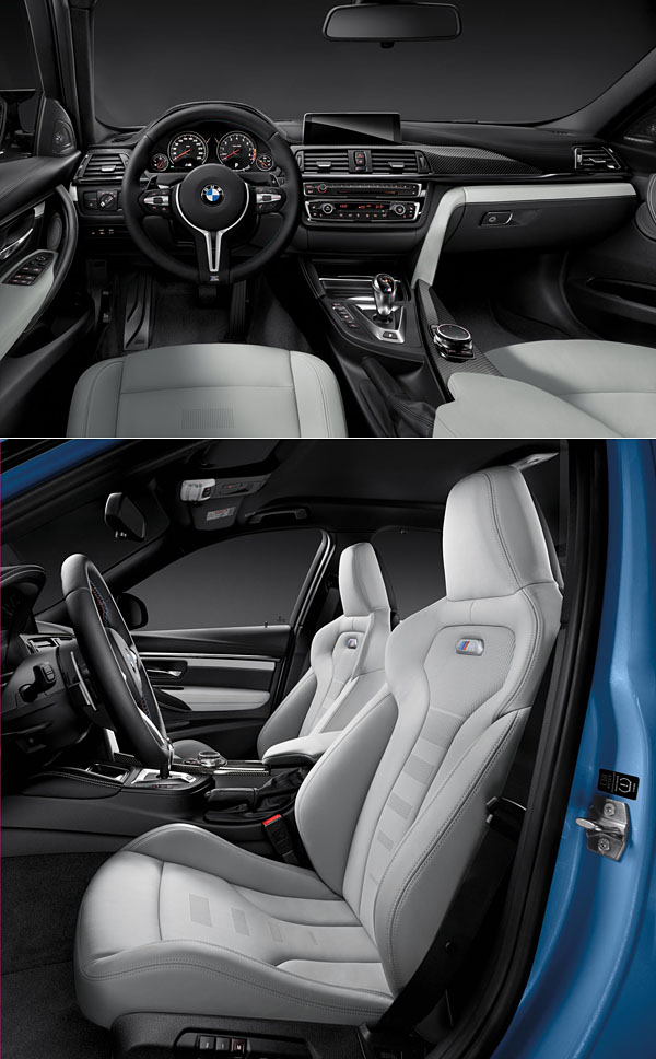 選擇於北美底特律車展正式登場的新世代M3 Sedan,以F30世代3-Series車型基礎打造,在2812mm軸距基礎上,換上了鋁合金懸吊系統與碳纖維材質,其中車頂架購、引擎室拉桿、驅動軸等處皆採用碳纖維複合材料,引擎蓋與前側壁則為鋁合金,車身尺碼達到4671×1877×1424mm水準,並讓車身重量控制在1560kg(自手排版本),輕量化的要求下,也同時讓車身重心下降,跑車化懸吊讓前軸下降34mm之多,後軸則小幅揚起18mm,胎圈尺碼搭配為前225/40ZR18、後275/40ZR18。而M4 Coupe軸距相同外,車身尺碼則為4671×1870×1383mm,車重更較過去M3 Coupe減輕80kg之多,而風阻不分M3 Sedan與M4 Coupe,同樣為0.34Cd。