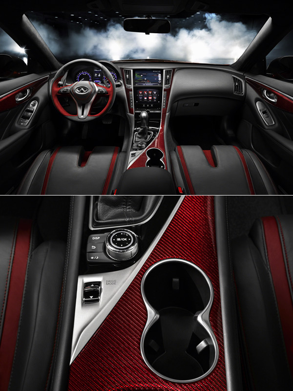 賽車化的設計延續至Q50 Eau Rouge概念車的內裝,包括車門內側、與中控台上的紅色飾板,也都是碳纖維材質的製品。