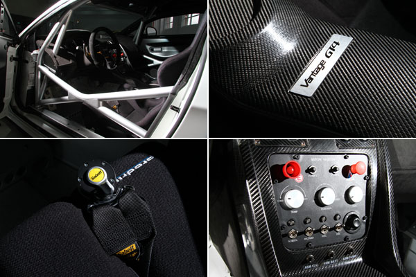 Vantage GT4純種賽車具備了完善的安全防護裝備,包括了賽車拖車勾、全車防滾籠與滅火裝置,行李廂中設有滅火器,當車輛起火時,除了可藉由車內開關開啟自動滅火外,還可就由前擋風玻璃下緣的拉柄操作。