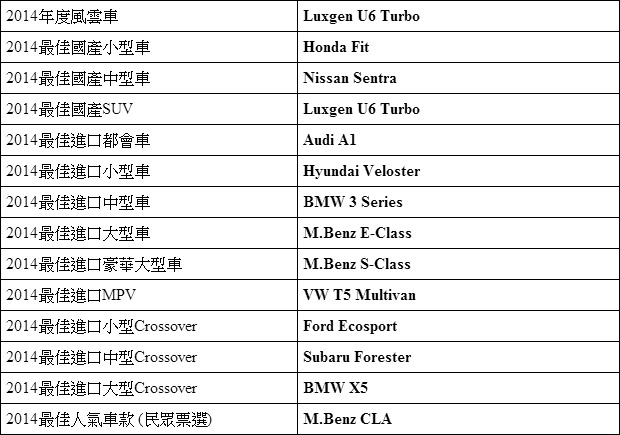 經過29位來自汽車媒體、台灣及日本專業車手、新聞廣播媒體主持群及藝人評審的嚴格評選,經過兩輪的不記名投票決選,Luxgen U6 Turbo最終獲得多數評審的肯定,榮獲2014年度風雲車大獎!評審團同時也評選出12個級距的年度最佳車款,提供國內消費者購車時的重要參考依據。
