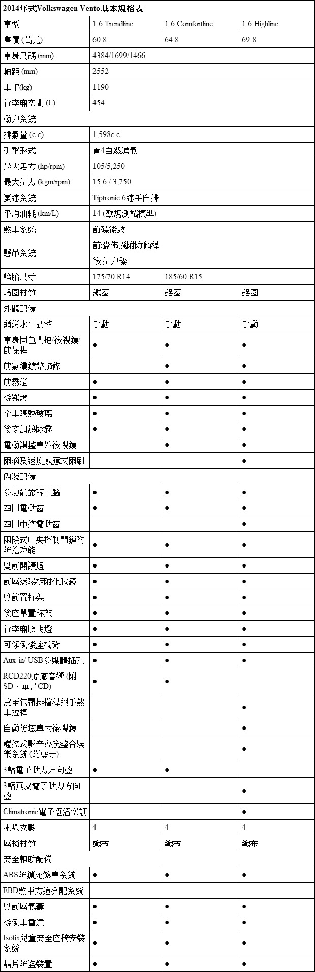 Volkswagen Vento規配表: