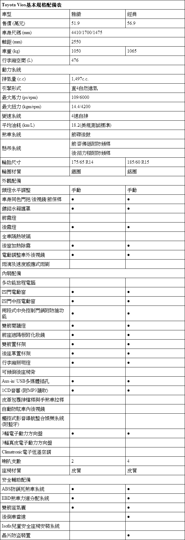 Toyota Vios規配表: