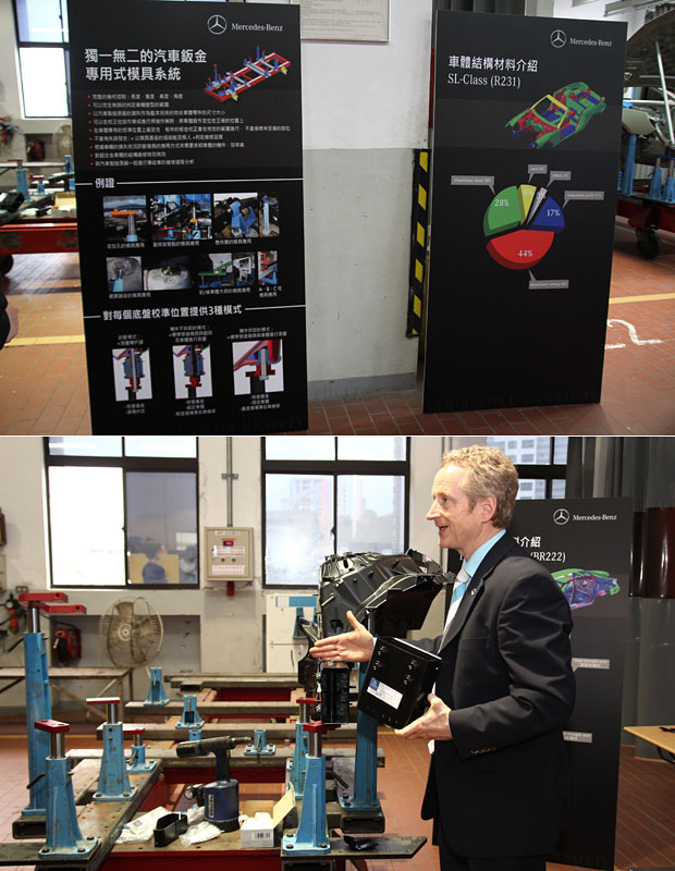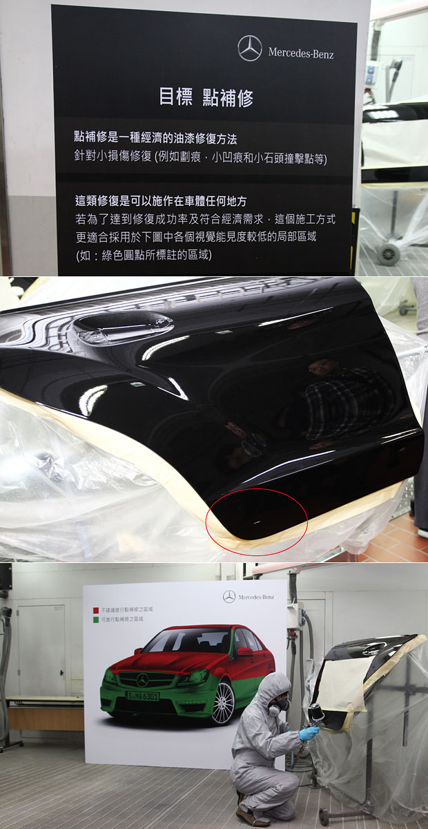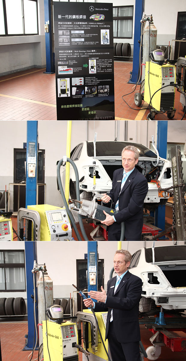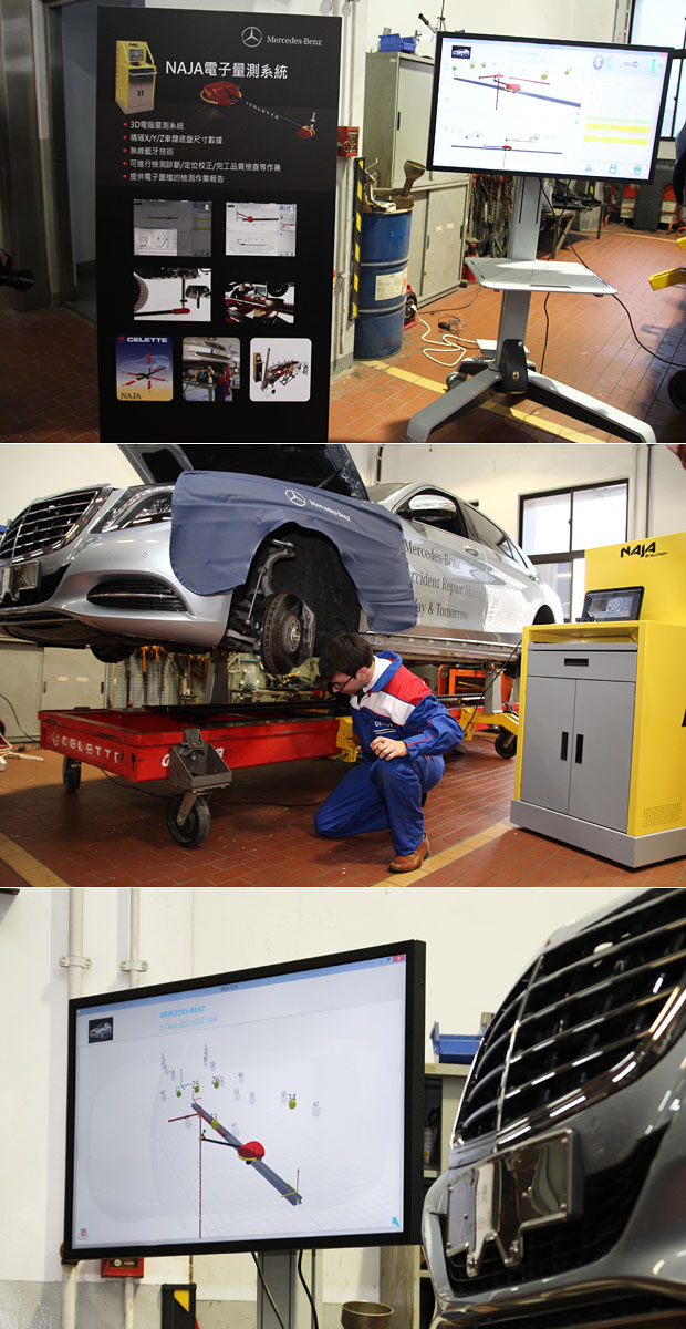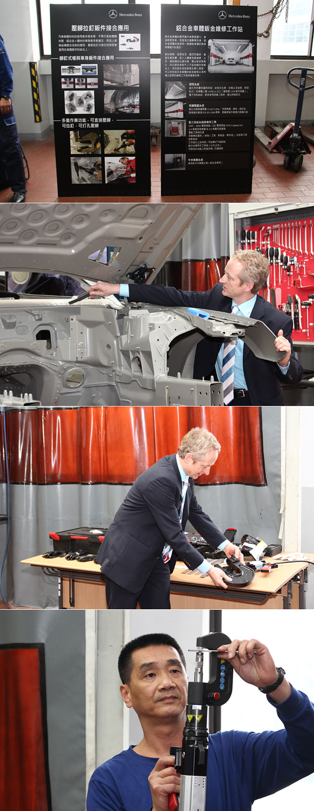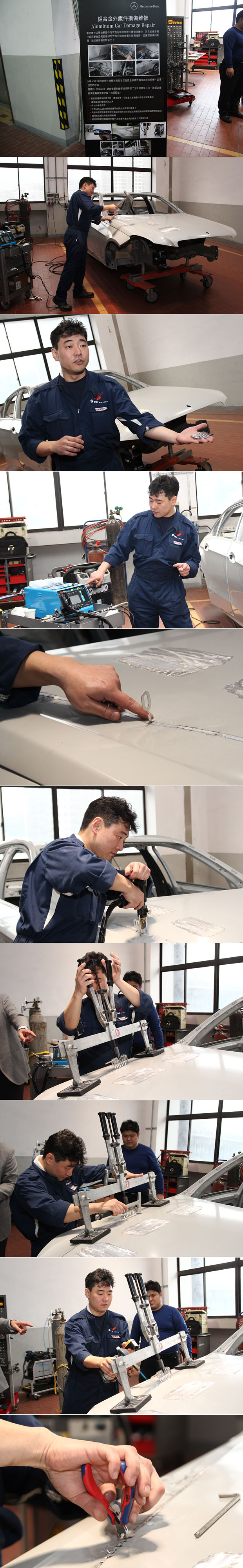 當輕量化車身大幅運用鋁合金材質於車輛鈑件上,車體維修技術亦有產生與傳統鋼材不同的維修技術,鋁合金材質焊接技術不僅需要使用高科技的專業設備、工具、與獨立工作區,更需要如藝術家般高深的鈑金噴漆技術。台灣賓士針對此領域同步於軟硬體面強化。硬體部分,不僅於關渡成立鋁合金鈑金噴漆維修技術中心,Mercedes-Benz在亞太地區僅有台灣賓士有此鋁合金維修技術設備。軟體部分,中華賓士長期以來致力於紮根台灣技術能力培育,而今位於關渡的鈑噴維修技中心更已成為亞太地區唯一的職能訓練中心,身兼亞太地區專業技術支援與顧問角色,並定期培訓合格技術人員,長期養成專業人員。由此可知,Mercedes-Benz母廠不僅對於台灣賓士在豪華市場經營的肯定,對於售後服務環節投入的心力,更加認同。