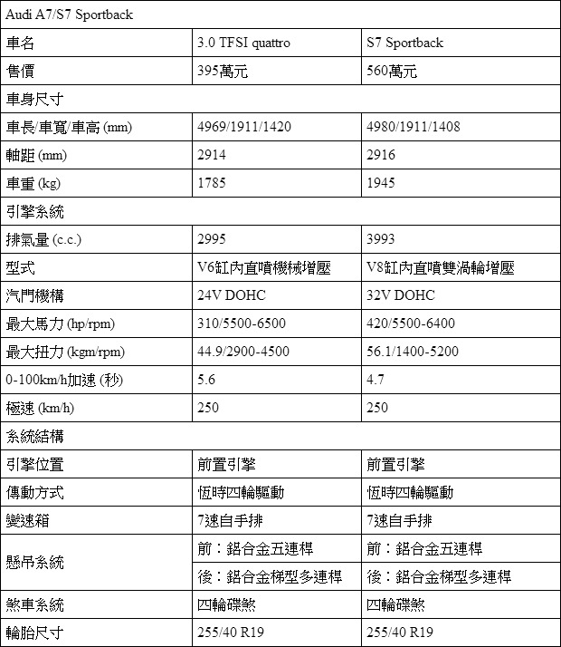 售價落在395萬元的A7 Sportback,4969mm的車長與Ghibli相近,引擎蓋下的3.0升機械增壓引擎排氣量也與Ghibli相當,雖然310hp馬力的最大輸出並不如Ghibli的330hp,但標配quattro四輪驅動系統,斜背尾門的空間運用彈性、Audi一貫精緻豪華的內裝以及較為親民的售價,是A7 Sportback的優勢所在。若是面對開價512萬元、410hp馬力輸出的Ghibli S Q4,Audi也有搭載4.0升V8雙渦輪增壓引擎,可提供420hp馬力並具有氣缸暫歇系統兼顧環保的S7 Sportback可以應對。