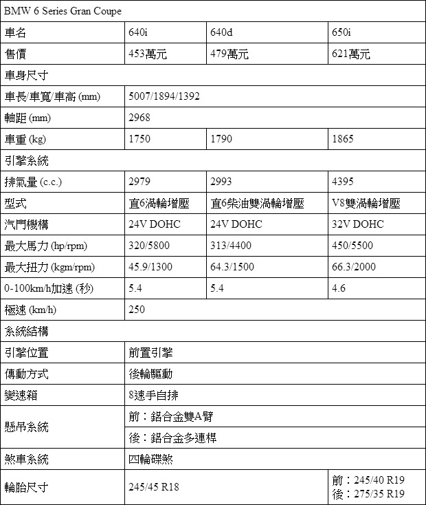 以國外Ghibli的全車系動力而論,國內提供640i、640d與650i等3種車型BMW 6 Series要屬最能應對的一支,從3.0直6渦輪增壓、3.0升直6柴油渦輪增壓到4.4升V8雙渦輪增壓的動力編成,到320hp、313hp到450hp的馬力輸出,也正好可以全面涵蓋Ghibli動力陣容的輸出表現。在加上BMW一貫堅持的後輪驅動設定,還可以提供更具樂趣的操控表現。不過,平均較高的建議售價,是BMW 6 Series應對Ghibli的弱勢所在。