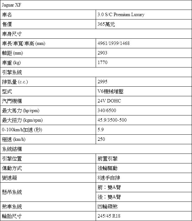 在造型上強調運動性格的Jaguar XF車系,雖然不若Ghibli或是其他4門Coupe對手一般,採用更具跑格的無窗框設計,但受惠於新一代Jaguar的設計風格,類Coupe的線條輪廓,也讓XF擁有深具動感的氣息。而其中的3.0 S/C Preium Luxury車型也正好與Ghibli的產品調性相仿,透過3.0升機械增壓引擎的幫助,340hp的最大馬力與Ghibli相比也絲毫未顯遜色,再加上365萬元的價格優勢、全鋁合金車體結構與英倫風格的車室設計,都讓XF 3.0 S/C Preium Luxury可以佔有一席之地。