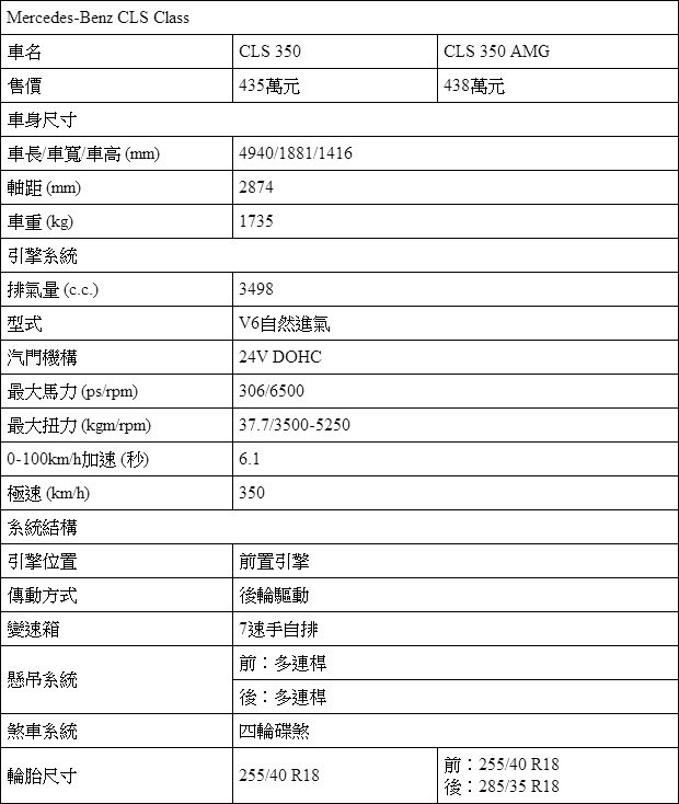 揭起4門Coupe風潮的Mercedes-Benz CLS-Class,絕對會是Ghibli最直接的對手之一,撇開排氣量與動力輸出皆超出甚多的CLS 63 AMG,擔任主力的CLS350 BlueEFFICIENCY車型,無論價錢或是車型設定都與Ghibli相仿。雖然引擎室內的3.5升V6自然進氣引擎僅能提供310hp的馬力輸出,435萬元 (AMG套件車438萬元) 的價格也較Ghibli的入門車型稍高,但Mercedes-Benz的品牌形象絕對是CLS-Class的競爭優勢。