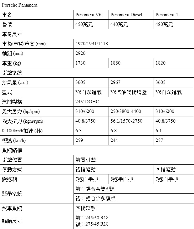 論起背景與品牌形象,Porsche與Maserati的相似程度,要比上述各款4門Coupe要更為接近。長久經營跑車市場的Porsche,在2009年推出4門房車Panamera,跨足豪華性能房車的市場,車長4.9米的Ghibli也正好與Panamera相仿。不過,價格帶橫跨450萬元至1120萬元的Panamera,攤開車系清單,真正能被Ghibli所威脅的,要屬450萬元的Panamera V6、440萬元的Panamera Diesel與480萬元的Panamera 4。就動力輸出而言,Panamera V6與Panamera 4所搭載的3.6升V6引擎,可以提供的300hp馬力,以及Panamera Diesel中3.0升V6柴油引擎所給予的250hp馬力也與Ghibli同級動力,或許才是最主要的對手所在。