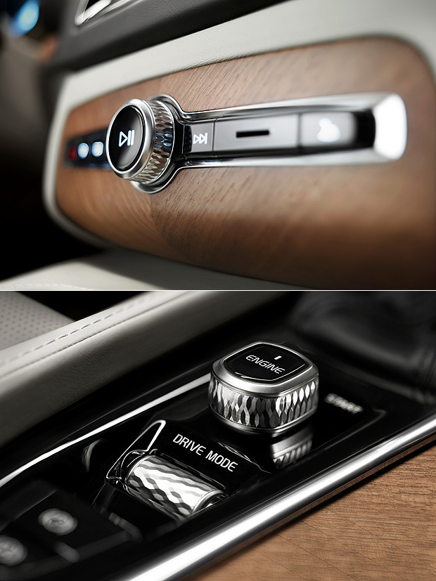 不過,內裝整體設計卻與現行Volvo家族的氛圍有著極大的差異。已經成為Volvo家族特色的懸浮式中控台在新一代XC90上已不復見,取而代之的是一片類似於平版電腦的觸控式螢幕,作為新一代XC90車載多媒體控制系統的中樞。於此同時,Volvo也相對地簡化中控台實體按鍵,雖然目前仍未公布新款車載多媒體控制系統的介面,可想而知的,將會是以觸控為主要的操作模式。